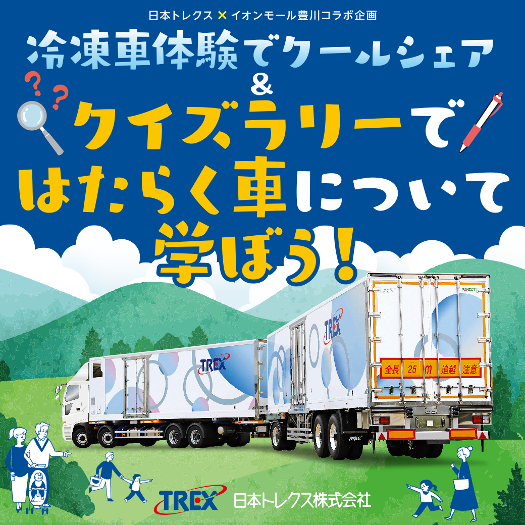 イオンモール豊川とのコラボイベント「冷凍車体験でクールシェア&クイズラリーではたらく車について学ぼう!」を開催します。皆さまのご来場を心よりお待ちしております。